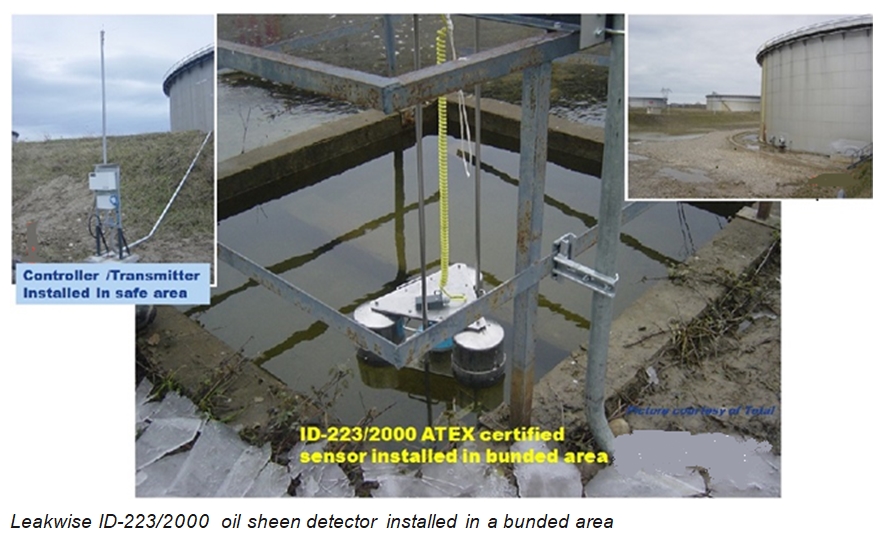 A Leakwise ID-223 oil sheen detector installed in the collecting sump will continuously monitor the water before releasing it to public water. If oily water is detected, an alarm will be set off and the water outlet valve will be closed. The oily water could then be (manually or automatically) diverted into an API separator or any other oily water treatment system. Such operation method will reduce the load on the water treatment system, may reduce system size, and eventually cut treatment costs.
