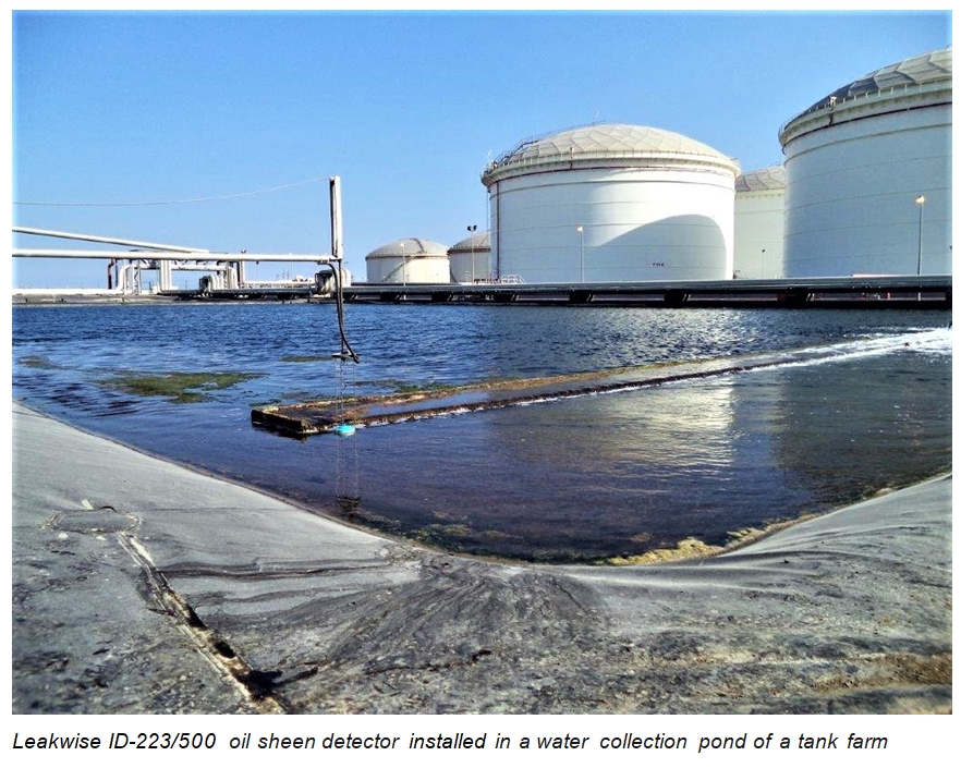 Even sophisticated tank gauging systems cannot detect small leaks of oil or fuel from large tanks to groundwater. Current health standards allow drinking water to contain less than 1 ppm of hydrocarbons. This means that an undetected leak of 1 liter/gallon of hydrocarbons can contaminate more than 1 million liters/gallons of groundwater. A Leakwise ID-221 oil sheen detector installed in a groundwater monitoring well near the tank will give a reliable warning on hydrocarbon seepage into groundwater much earlier than any manual sampling.