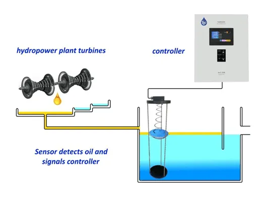 The energy is introduced to the upper layer of the water. Since water absorbs more electromagnetic energy than hydrocarbons, changes in the absorption rate of the water indicate the presence or buildup of a hydrocarbon layer. The sensor continuously sends the measured signal to the processor,